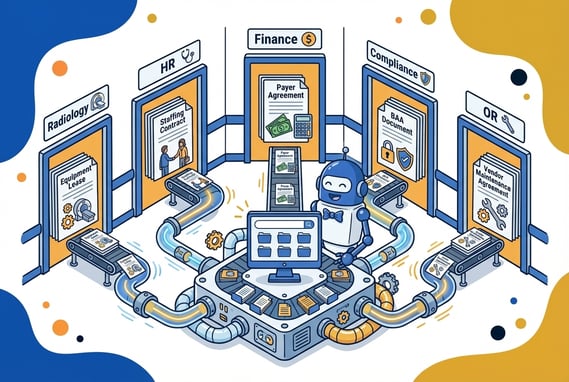 The radiology lease is in one tool. The payer contracts are in a spreadsheet. The BAAs are in a shared drive. And the staffing agreements are in someone’s email.