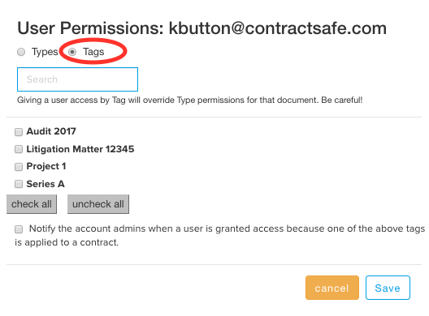 Admin - These power users can do it all - manage users, access every contract, and customize your entire ContractSafe setup with folders, tags, custom fields, and views.