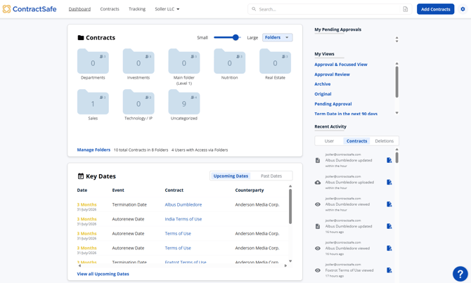 1) The Dashboard: Where you can see at a glance a summary of all your contracts, your important dates (upcoming and past), the audit trail for all the activity in your account, and the Saved Views that you have created or which have been shared with you.