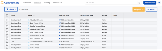 2) The Contracts List: This is where all your contracts live at a summary level. This is where newly-uploaded contracts are located, where you can see your search results, where you can filter your contracts, and where you can generate reports. You can toggle between multiple Saved Views to access different display templates for your Contracts List depending on what details you want to focus on.