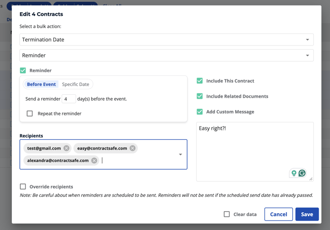 - Configure Reminder Settings: With Bulk Edit activated, you have the flexibility to define reminder settings that will apply to all selected contracts.