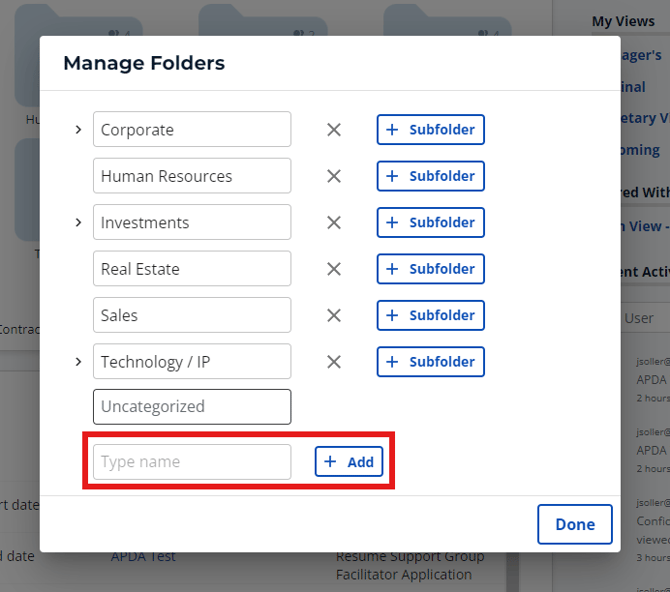 After clicking Manage Folders, a small window will pop up. Type in the name of a new folder and select + Add or click the data field with an existing name you want to change and proceed to type the new folder name.
