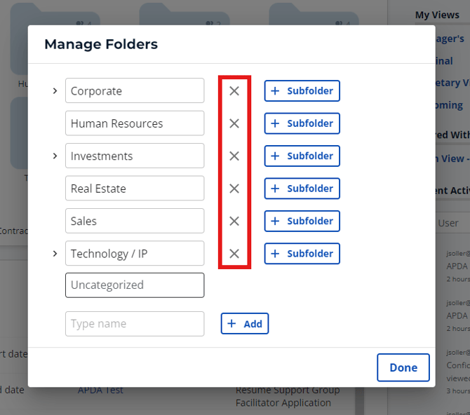 If a top-level folder is deleted, its contracts will be moved to the Uncategorized folder. Depending on your user role, you may or may not see this Uncategorized folder.