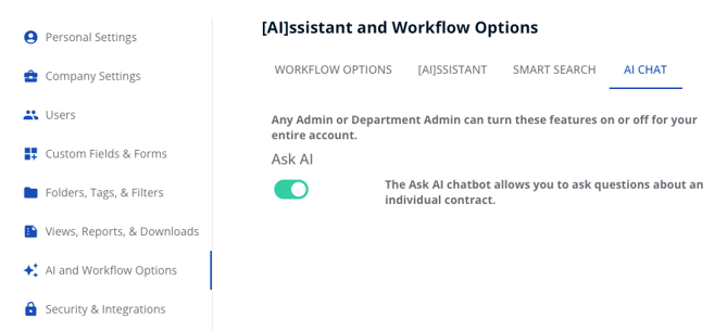 This feature is on by default for all organization (besides Canada for now), but if your admin needs to turn this on or off, they can go to Settings >AI and Workflow Options > AI Chat and turn on/off the Ask AI chatbot.