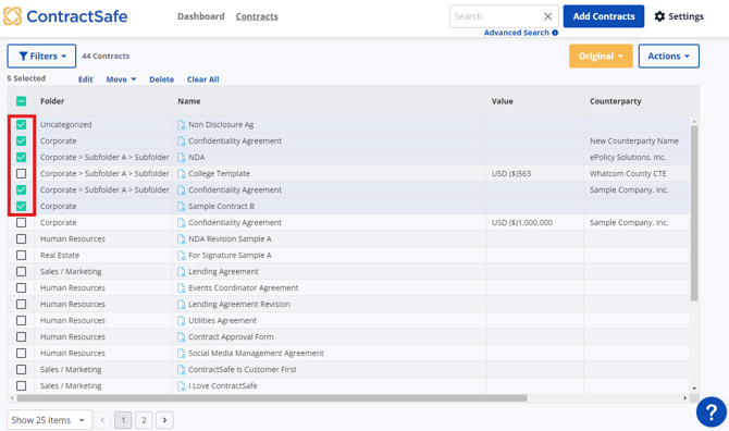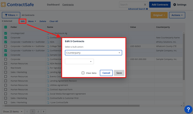 1) Select the contracts you want to bulk edit by ticking the box inline with them.