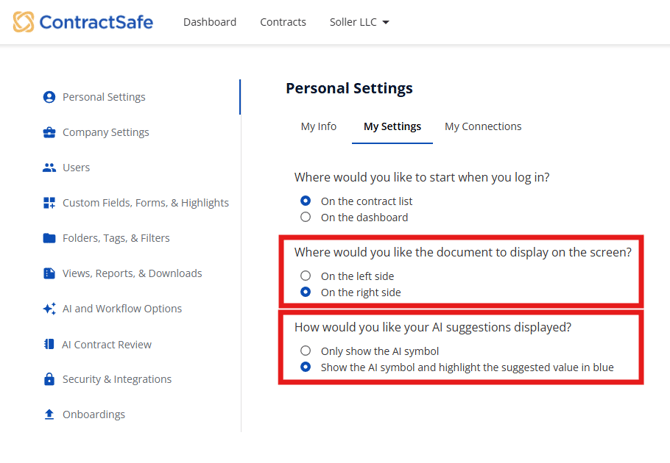 To adjust your contract page settings, go to Settings > Personal Settings > My Settings