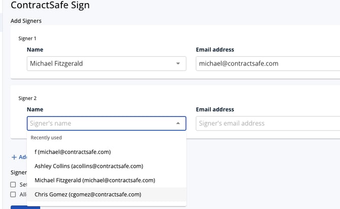 Add your signers by typing out their name and email or select from a list of previously used signers.
