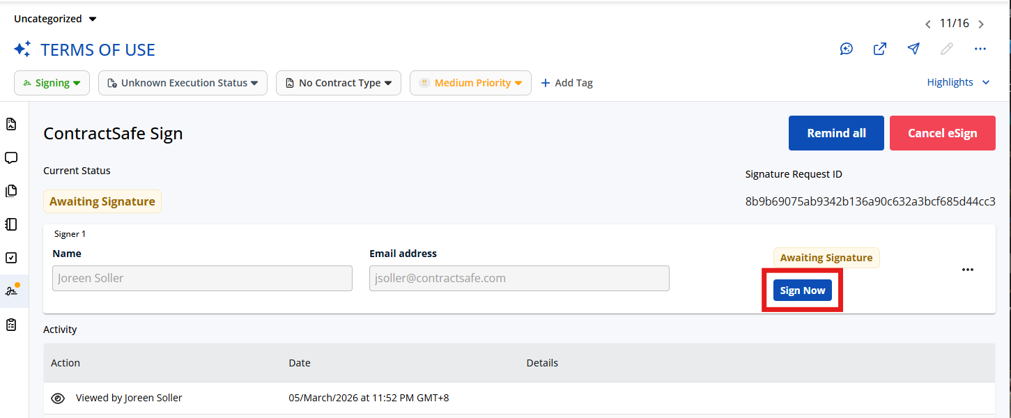 How it Works: To use this feature, simply open a contract with a pending request and select the Sign Now button.