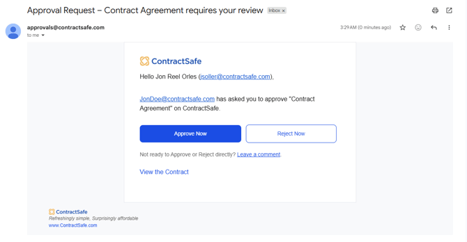 When you request Approval, approvers will receive an email from approvals@ContractSafe.com like the image below. It will include the name and email of the requestor, a direct "Approve Now" and "Reject Now" button, or the option to leave a note on the approval request without Approving or Rejecting.
