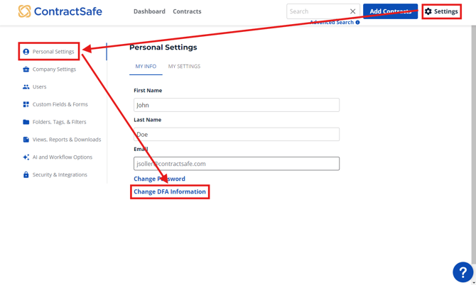 To change or update your DFA method in ContractSafe, click on Settings >Personal Settings>Change DFA Information