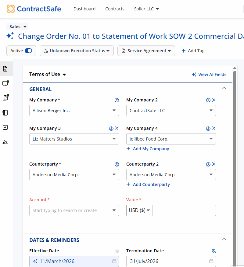 Tip: For better key dates management, you may also click the grey bell icon adjacent to the Termination date to set a reminder. For more details on setting up reminders, please check out this article: Setting Date Reminders