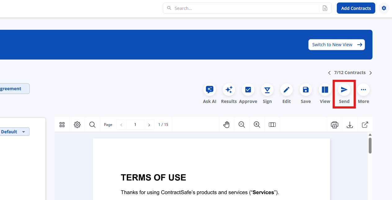 This is where the Send button can be found if you are using the Legacy Contract page: