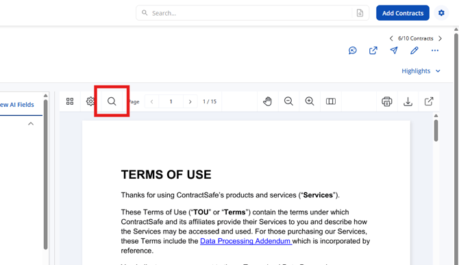 This is where the magnifying glass (search within a document) is located on the Legacy Contract Page: