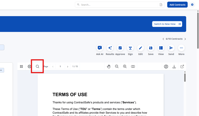 This is where the magnifying glass (search within a document) is located on the New Contract Page: