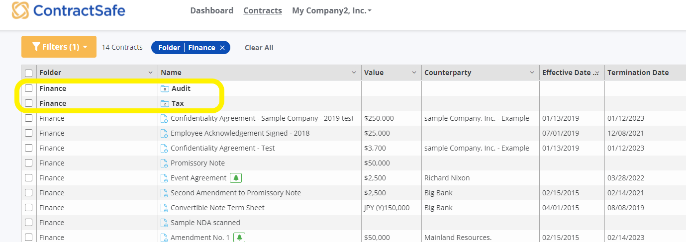 2. Select Filter and then Folder from the Contracts List. All Subfolders are indicated wherever a sideways arrow is displayed.