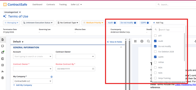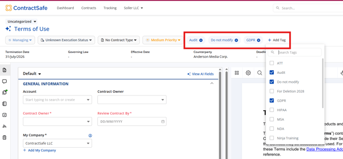 In ContractSafe, you can apply unlimited Tags. To apply a Tag to a document, go to the Contract Page where you'd like to add the Tage, click “Add Tag +”. A dropdown list will appear and you can select as many as are applicable.