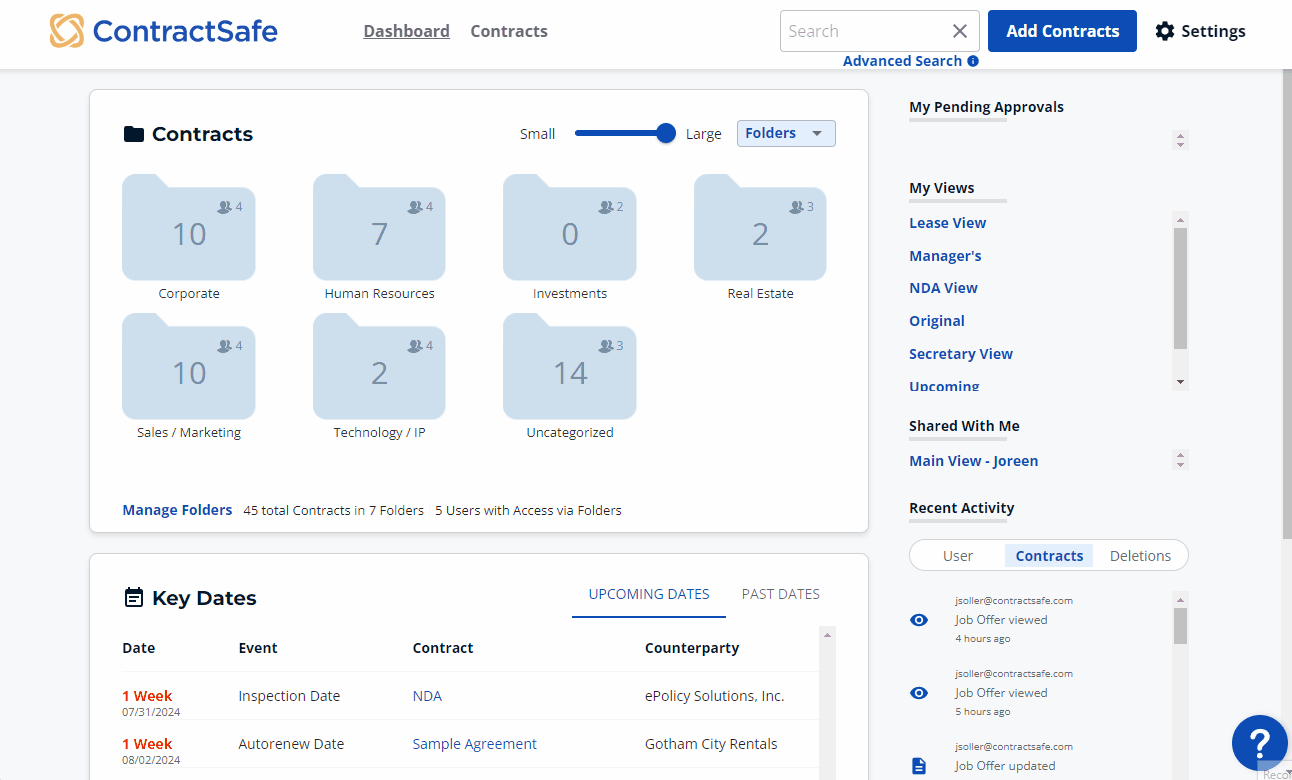 Many companies have individuals responsible for maintaining specific Folders in ContractSafe. Maybe Rob is responsible for maintaining the HR and Legal Folders. Suzanne oversees Finance and Corporate. And so on. In ContractSafe you can easily choose who gets notified when new contracts are added to a folder.