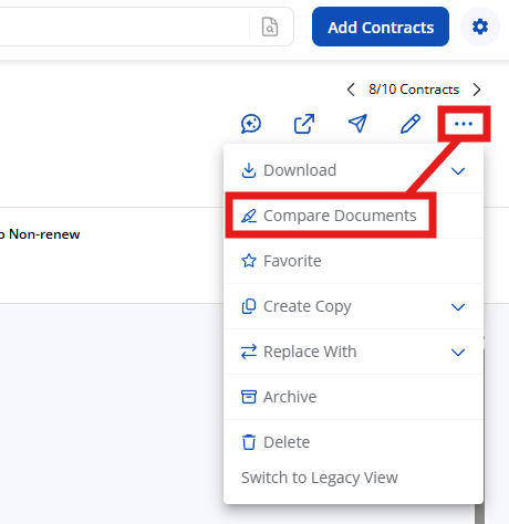 - Select Redline (legacy) or Compare Documents (New Contract Page)