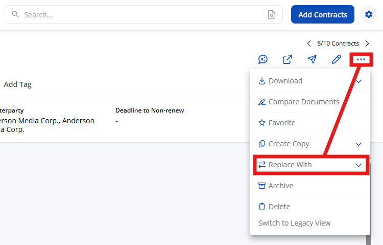 - Once you've selected a document and have accessed its Contract Page, select More (Three dots) in the top right-hand corner.