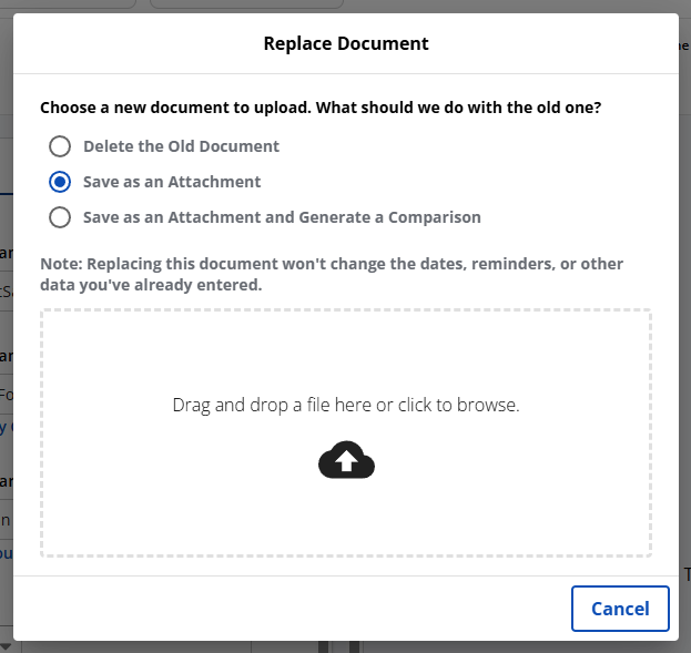 - Select Save as Attachment and Generate Redline, then drag and drop a file or click the cloud icon to browse for the replacement document.