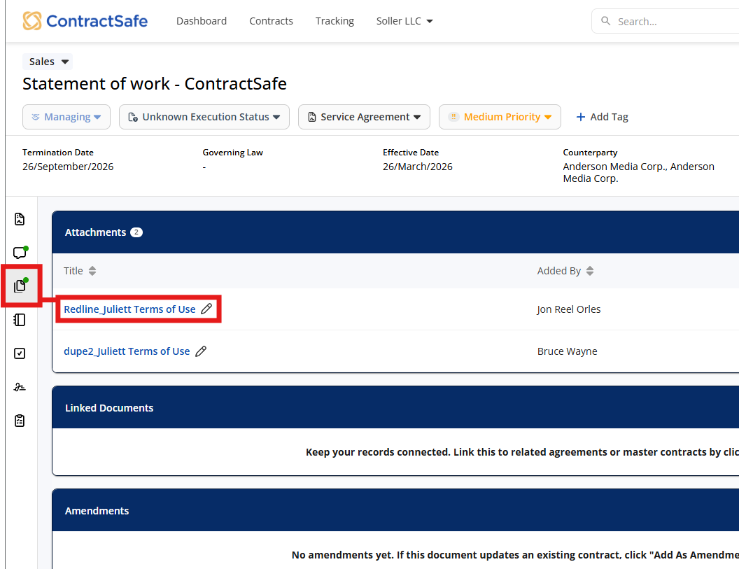 - You will now see the newly uploaded contract and your old one added as an attachment. You can view your redline results by accessing the redline document added to your attachments.