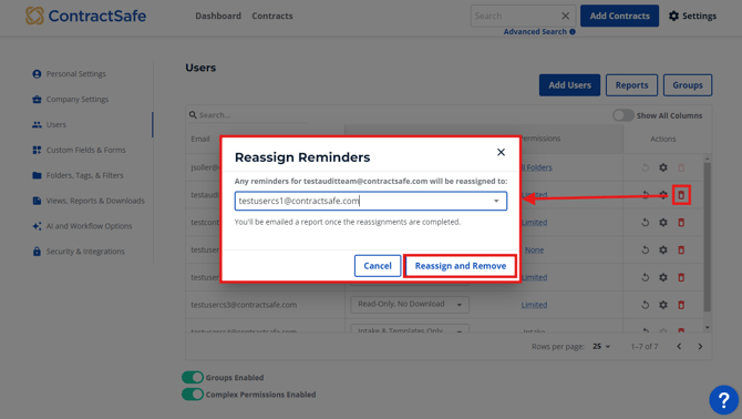 If you already deleted the User from your account or want to reassign a User's reminders without deleting the User from your account, we can handle that for you. Just contact us at support@ContractSafe.com with the details and we'll be happy to make the change.
