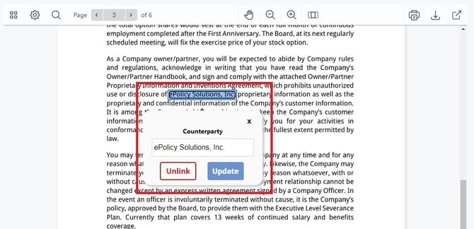 After accepting the values, new highlights will be created on your contract. These terms highlighted in blue are the values you accepted earlier. You can then click on each highlighted terms to see what Contract Field it reflects.
