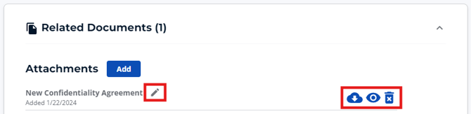 3. The Trash/Bin icon - Deletes the attachment. Note that attachment deletions are final and irreversible.