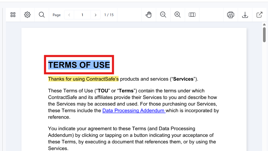 If the "Annotations" feature is enabled for your account, we will automatically highlight in blue where we found each [AI]ssistant item in the contract. In the screenshot below, the Contract Name was identified and automatically highlighted.