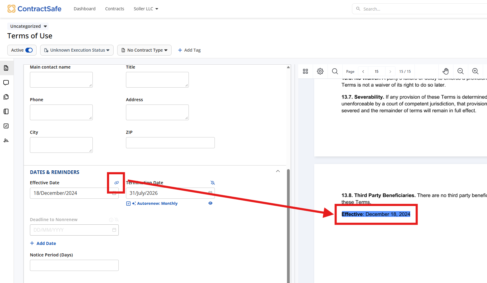You can always select the link icon on the field to navigate directly to the related provision in the contract.